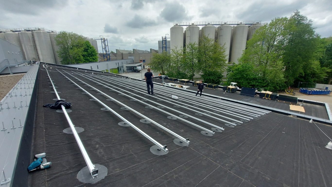 Binnen de nieuwe R&D faciliteit van Heineken werd groen uiteraard een belangrijk thema. En dat hebben ze doorgetrokken naar dit hellende bitumineuze dakvlak, waar wij middels verankering in het onderliggende staaldak de Blubase draagconstructie en 168 Aiko glas/glas panelen hebben aangebracht. Het geheel is aangesloten op een Huawei stringomvormer.
