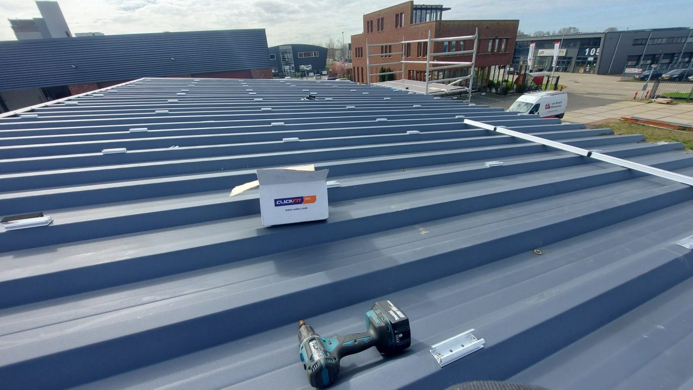 Een fijne samenwerking met deze aannemer. De houtschuur op hun terrein met hellend staaldak leende zich heel goed voor het aanbrengen van een Esdec Clickfit Evo draagconstructie, waarop wij 70 PV panelen hebben aangebracht.